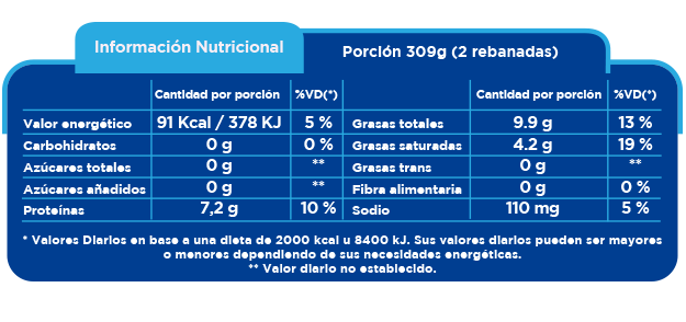 Ingredientes: Leche pasteurizada, fermentos lácticos, sal, cuajo, cloruro de calcio, colorante: Annato. CONTIENE LECHE