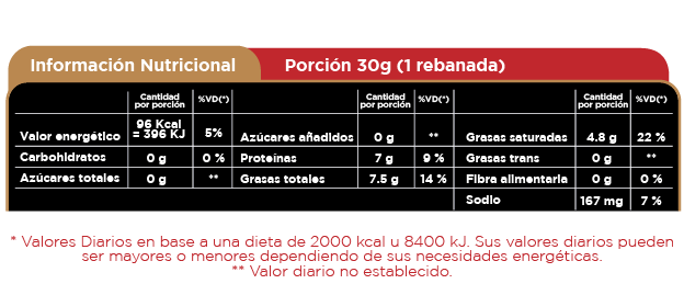 Ingredientes:Leche entera pasteurizada, fermentos lácticos, sal, cuajo, cloruro de calcio, colorante: annato - CONTIENE LECHE.