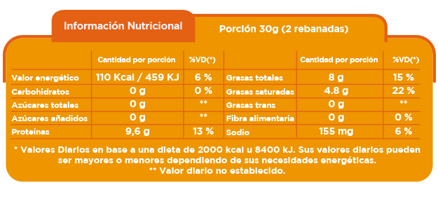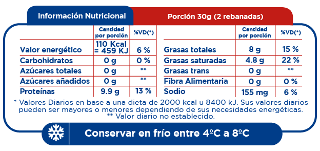 Ingredientes:Leche entera pasteurizada, fermentos lácticos, sal, cuajo, cloruro de calcio, colorante: annato. CONTIENE LECHE.